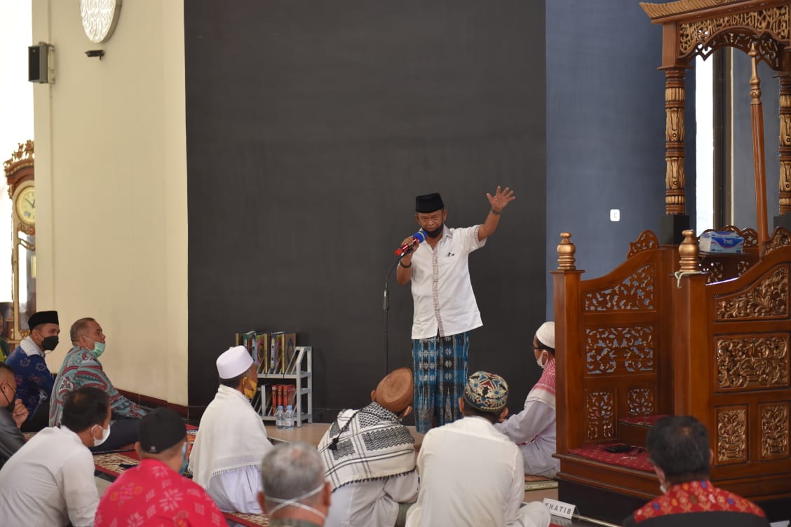 Gubernur Sulawesi Tengah H.Rusdy Mastura saat memberikan sambutan pasca sholat Jumat di mesjid Al Mujahidin kantor gubernur Sulteng, Pada Jumat 18/06/2021, ( Foto.Humas Sulteng ).
