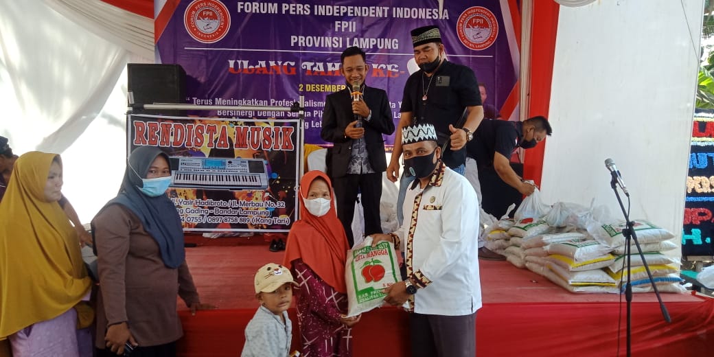 Gubernur Lampung Ir. Arinal Djunaidi yang diwakili Ganjar Jatono Kepala Dinas Kominfo Prov. Lampung, dalam sambutannya mengucapkan selamat ulang tahun kepada FPII Lampung serta mengaprisiasi kegiatan sosial pembagian sembako kepada sejumlah warga yang kurang mampu yang dilakukan oleh FPII.
