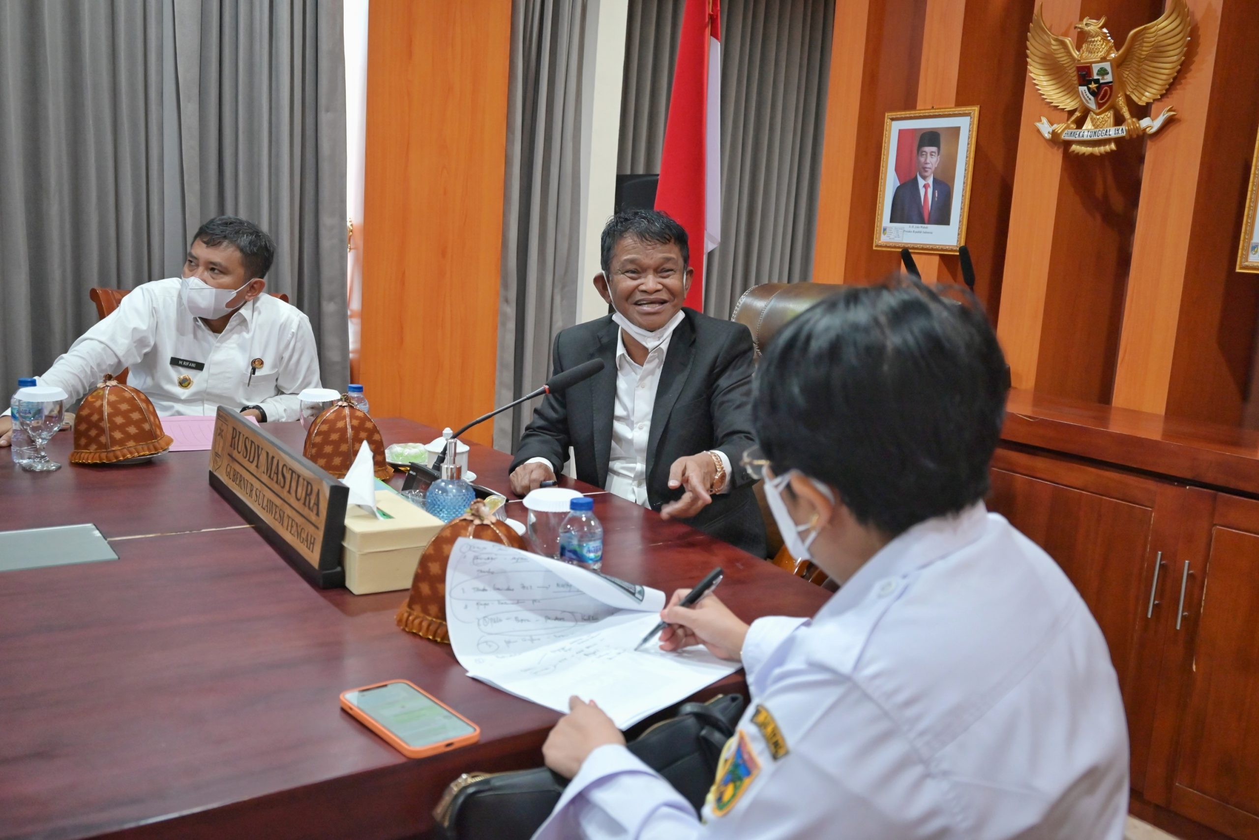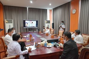 Gubernur Sulawesi Tengah H.Rusdy Mastura saat mengikuti dialog secara virtual bersama menteri Investasi dan BKPM Bahlil Lahadalia, terkait capaian realisasi investasi yang tahun 2021, di ruang kerja gubernur, Pada Rabu 16/02/2022.