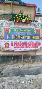 Berbagai karangan bunga ucapan turut berduka cita pun tidak luput terpajang mulai dipinggir pagar halaman sampai di sekitaran tenda rumah almarhum Thompa Yotokodi.