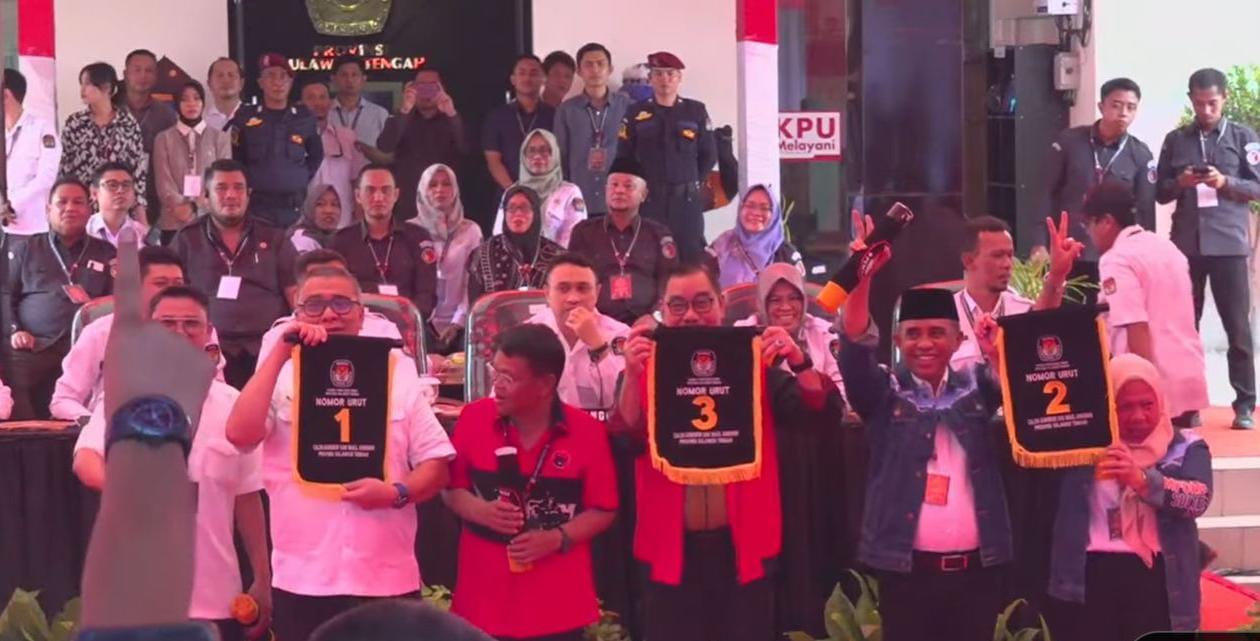 Palu, beritasulteng.id – Pasangan calon gubernur dan wakil gubernur, H Rusdy Mastura (Cudy) dan Sulaiman Agusto Hambuako (SAH) menyambut suka cita perolehan nomer…..di Sidang pleno Komisi Pemilihan Umum (KPU) Sulteng, Senin 23 September 2024 Jalan S. Parman Palu TImur.
