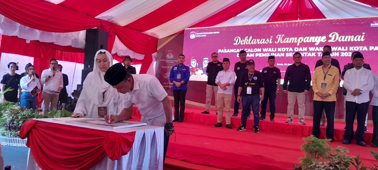 Pada acara tersebut, seluruh pasangan calon, termasuk Hadianto Rasyid-Imelda Liliana Muhidin membacakan komitmen mewujudkan Pilkada Damai di Kota Palu.